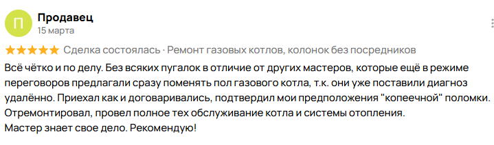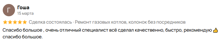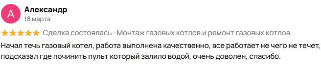 Я частный мастер и предлагаю полный спектр услуг по обслуживанию и установке газового оборудования. Специализируюсь на ремонте, чистке и обслуживании газовых котлов любой сложности: любые неисправности, диагностика, настройка.
